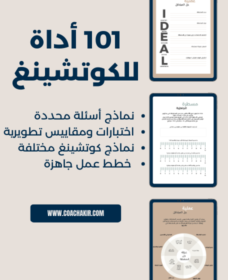 أدوات الكوتشينغ هي تقنيات واستراتيجيات يستخدمها متخصصو الكوتشينغ و المدربون لمساعدة الأفراد أو الفرق على تحقيق أهدافهم وتطوير قدراتهم. تشمل هذه الأدوات: